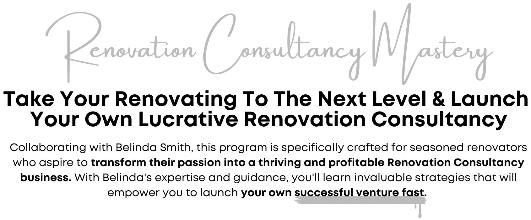 Those renovating skills of yours are your golden ticket to financial freedom. Your experience and knowledge are in demand – and can easily be transformed into a highly lucrative Renovation Consultancy business.