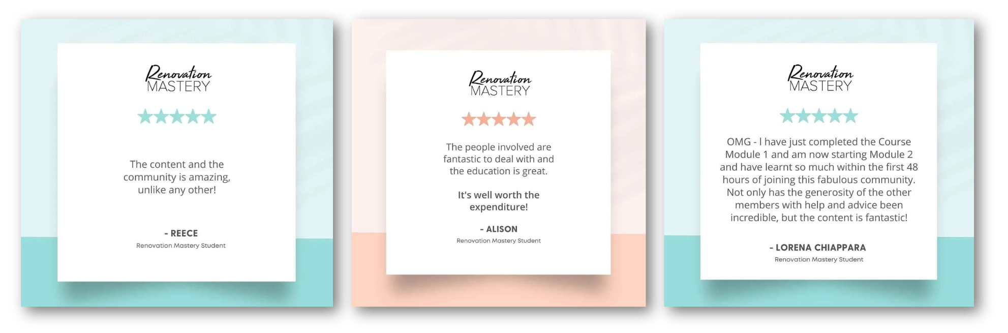 "Joining Belinda's renovation course has been one of the best decisions I've made. Invaluable information and community with daily posts, photo's, regular updates and constant interaction where you can ask as many questions as you like. Whether you're a rookie or experienced renovator, I'd highly recommend you jump on board too. Watch this space!“